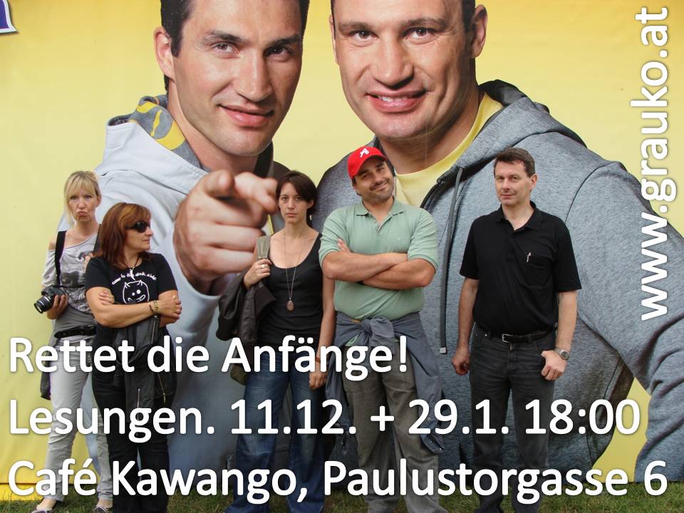 Die AutorInnen von GRAUKO haben nun mit der Doppelveranstaltung „Rettet die Anfänge“ eine Hilfsaktion für genau diese Texte begonnen. Am ersten Termin (11.12.) hat jede AutorIn drei Textanfänge präsentiert und es dem Publikum überlassen, darüber abzustimmen, welchen dieser Texte die AutorIn bis zum zweiten Termin, der gleichzeitig die traditionelle Grauko Jännerlesung (29.1.) sein wird, fertig schreiben soll.