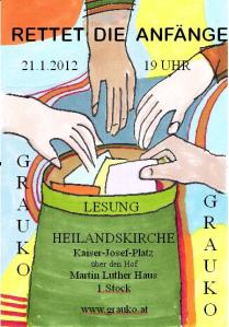 Nach dem großen Erfolg der Premiere im vergangenen Jahr, starten die AutorInnen von Grauko mit der Doppelveranstaltung „Rettet die Anfänge“ auch 2012 wieder eine Hilfsaktion für genau diese Texte. Bei unserer traditionellen Jännerlesung (21.1) wird jede AutorIn diesmal drei Textanfänge präsentieren und es dem Publikum überlassen, darüber abzustimmen, welchen dieser Texte die AutorIn bis zum zweiten Termin (17.3.) fertig schreiben soll.
