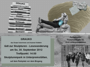 Der Herbst beginnt und im ganzen Land werden die Badehosen ein- und die Wanderschuhe ausgepackt. Gerade rechtzeitig für Graukos traditionelle Lesewanderung. Bereits zum achten Mal machen wir uns gemeinsam mit unserem Publikum auf den Weg. Abmarsch ist beim Eingang zum Skulpturenpark in Unterpremstätten (bei der Einfahrt zum Schwarzl FZZ) am Sonntag 30.9. um 14.00. (Treffpunkt daher bitte eine Viertelstunde davor!)