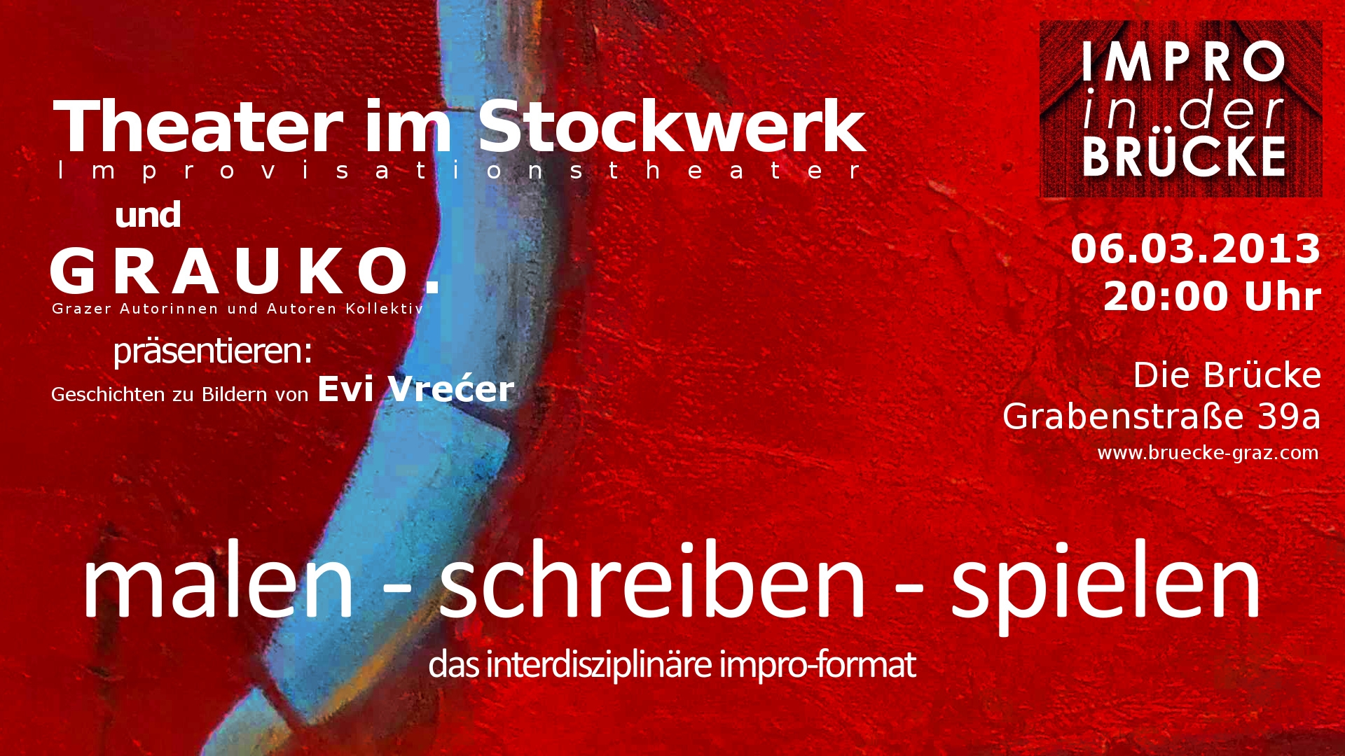 Die AutorInnen Isolde Bermann, Alex Kumer, Ute Schlerath und Peter Heissenberger haben sich in den letzten Wochen von je einem Bild der Grazer Künstlerin Evi Vrecer zu einem Text inspirieren lassen. Zu diesen Texten werden die Schauspieler des TiS am Mittwoch in der „Brücke“ (Grabenstraße 39, 20 Uhr) wie gewohnt improvisieren. Zudem kann das Publikum natürlich die entsprechenden Bilder selbst begutachten.