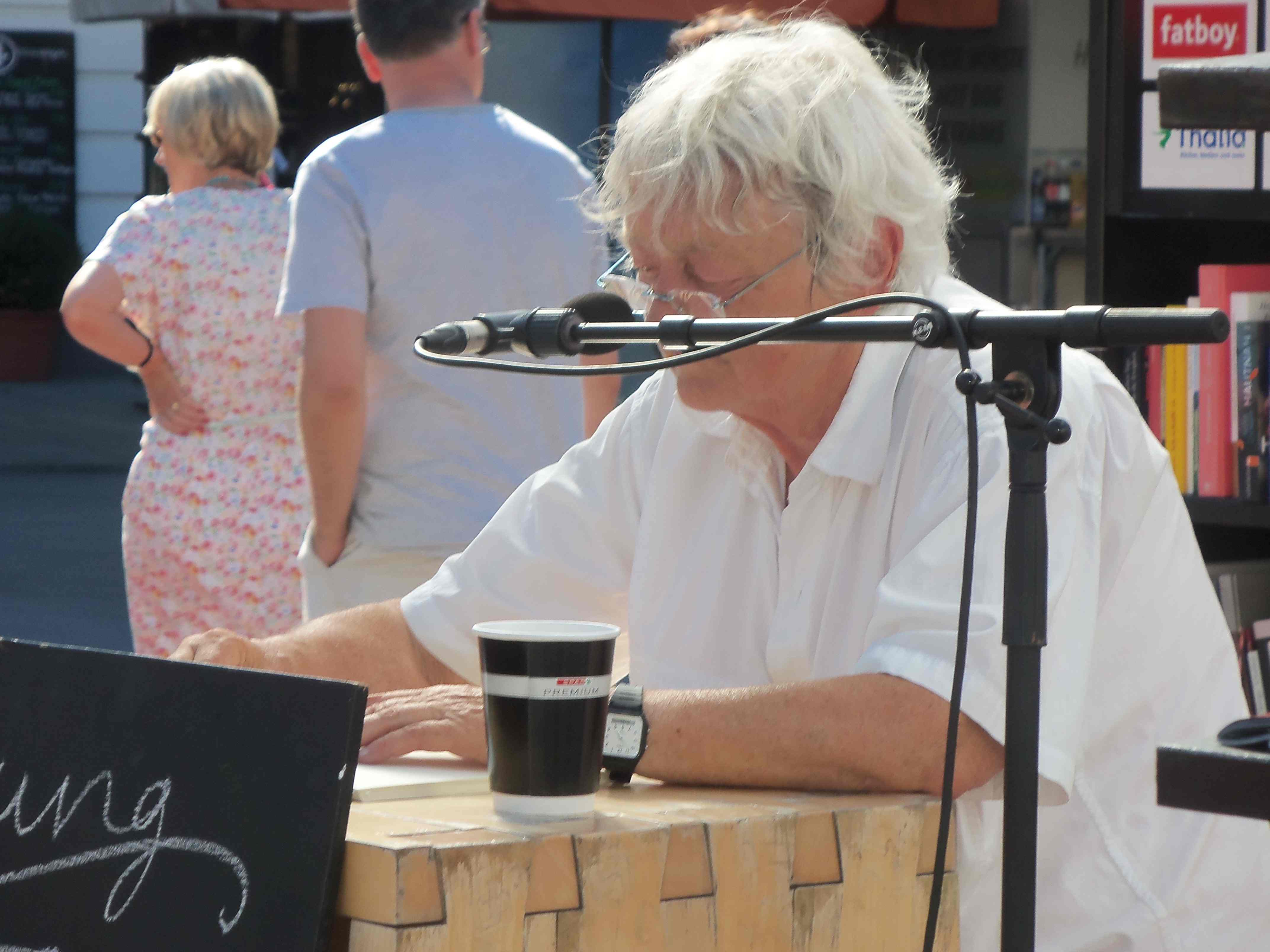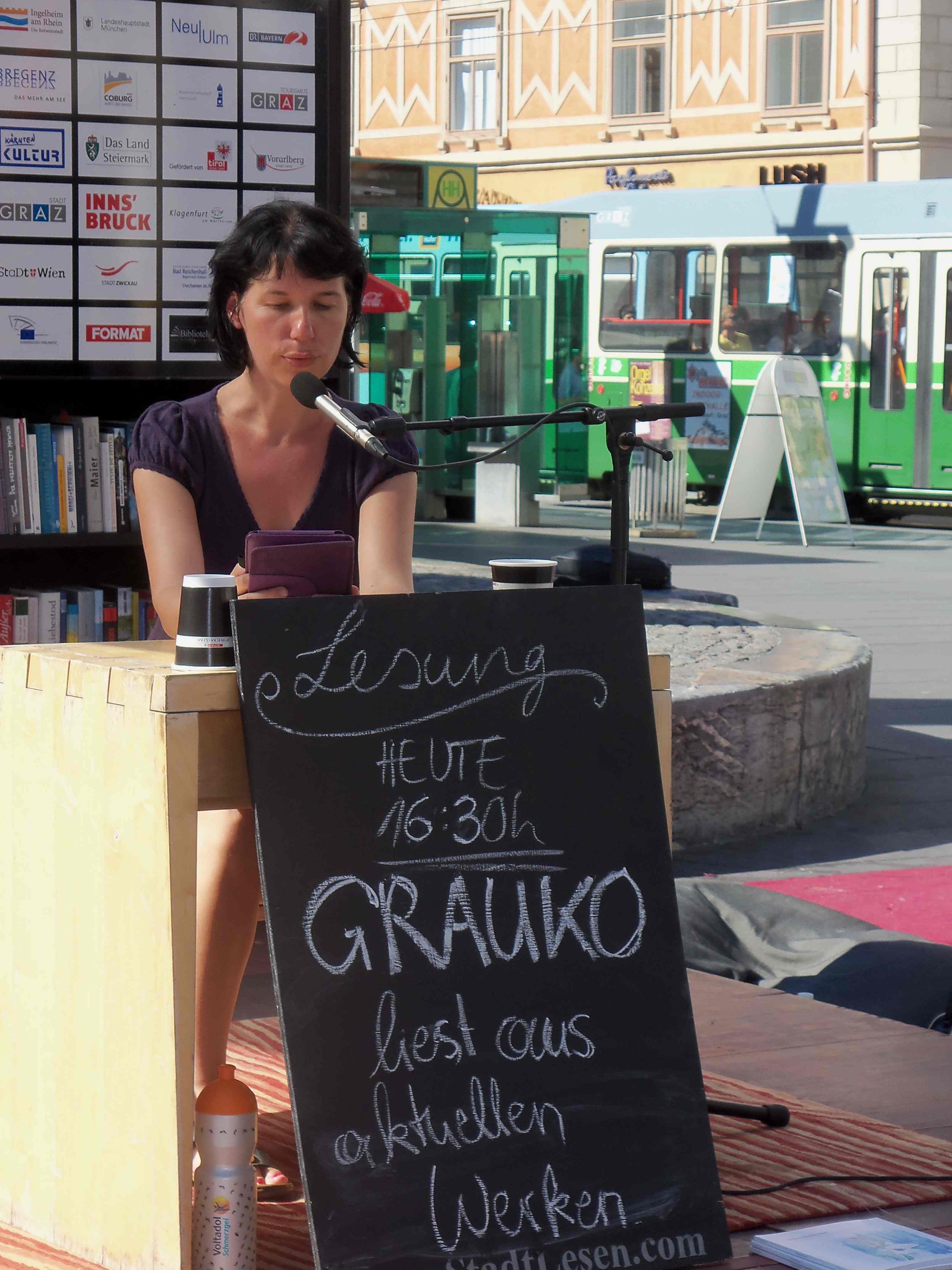 Liebe Freunde und Fans, es sei allen verziehen, die heute nicht pünktlich zum Beginn des Stadtlesens am Grazer Hauptplatz erschienen sind. Denn es war 16.30 und es war heiß! Bei Temperaturen, bei denen Bauarbeiter Hitzefrei bekommen haben sich fünf wackere AutorInnen von Grauko daran gemacht, Graz mit neuer Literatur zu versorgen.